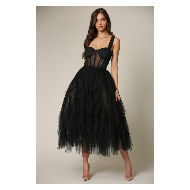 Maxi vestido de tulle multicapas con corsette copa preformada de satin tirante grueso con transparencia, cierre.