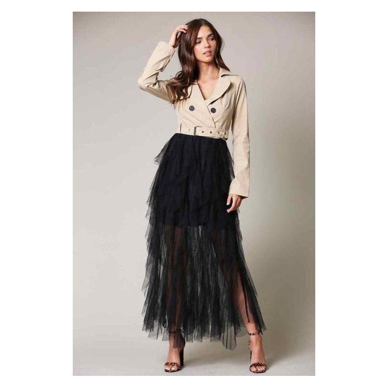 Maxi vestido con top tipo gabardina cruzado manga larga abotonadura al frente y cinturon con hebilla, y falda negra corta de forro con falda larga multicapa de tulle.