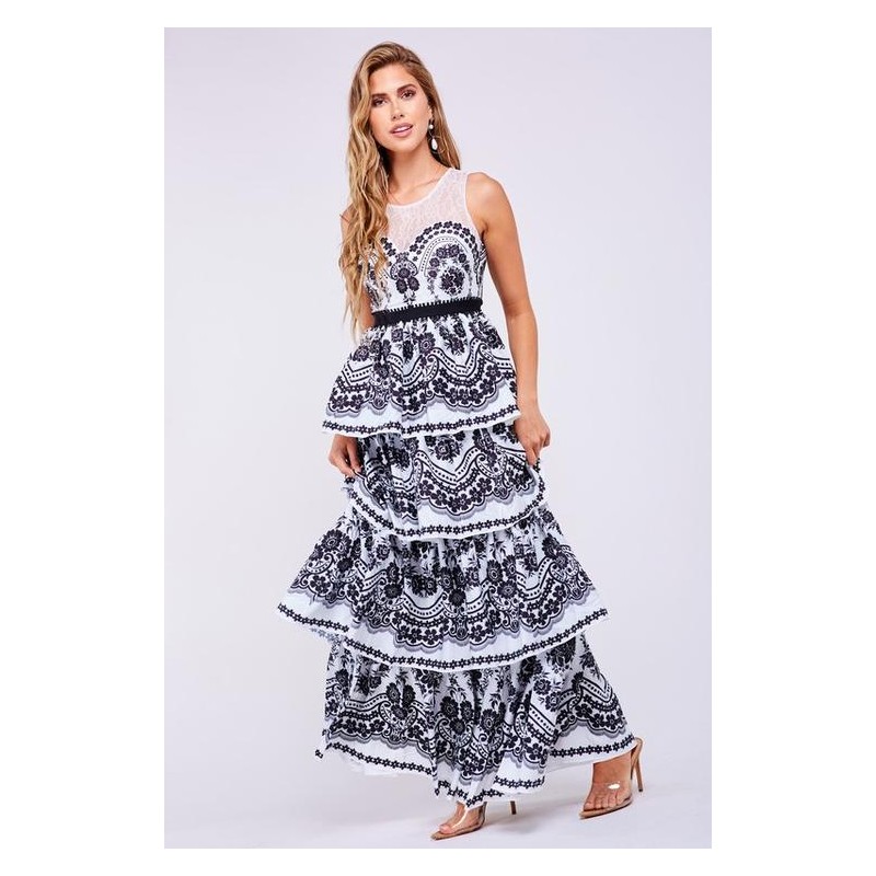 Maxi vestido cuello redondo, incrustacion de encaje blanco en pecho, sin mangas blanco con flores estampadas en negro, falda larga en capas cierre en espalda.