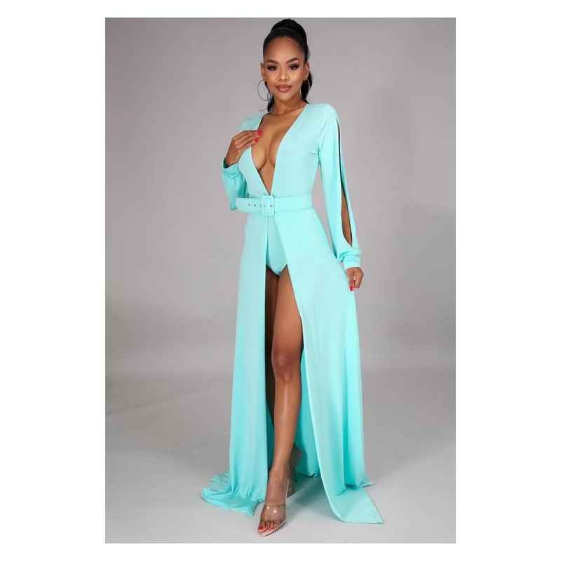 Maxi traje de baño vestido manga larga aberturas en los brazos puños abertura al frente incluye cinturon .