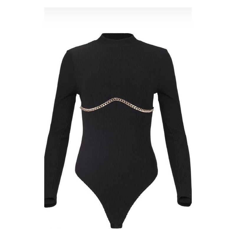 Pantiblusa con abotonadura en tanga manga larga cuello alto con cadena en frente en busto, cierre.