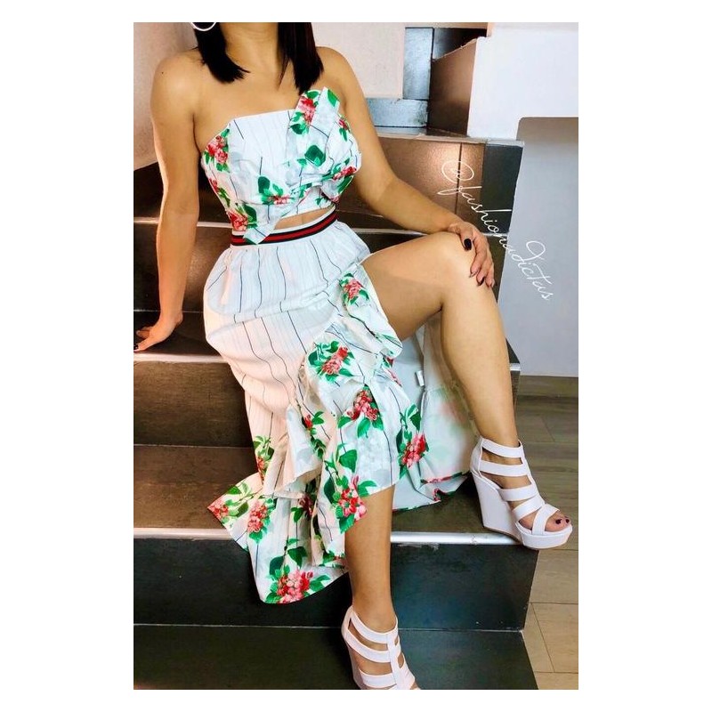 Set compuesto por top de una manga larga y falda irregular ruffle en falda cierre en costado. Estampado floral , tipo satin.