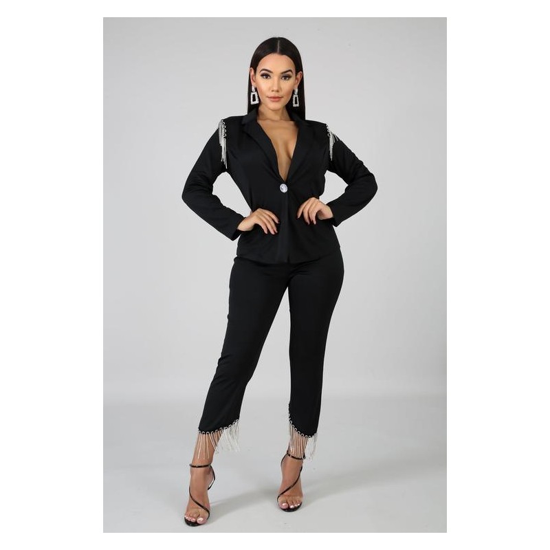 Set compuesto por blazzer con abotonadura plateada al centro, manga larga, aplicación de cristales como hombreras, pantalón corto con aplicación de barbillas en cristales en pantalón.
