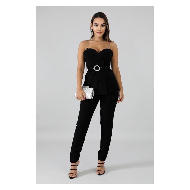 Set compuesto por top tirantes de cadenas , cinturón con dulce hebilla y pantalón corte alto cierre al frente.