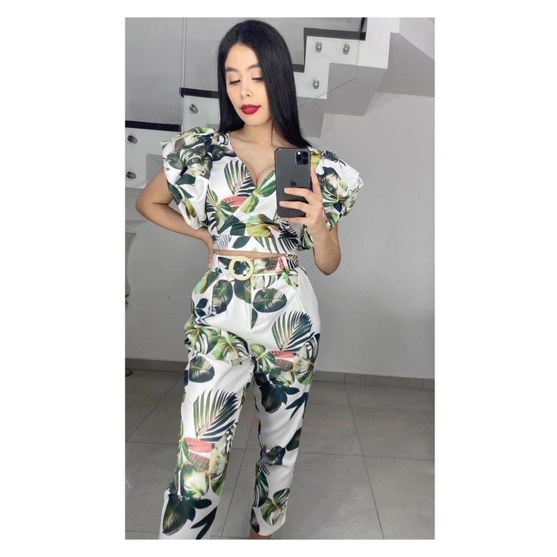 Set compuesto por camisa con abotonadura al frente y pantalon entallado estampado floral .