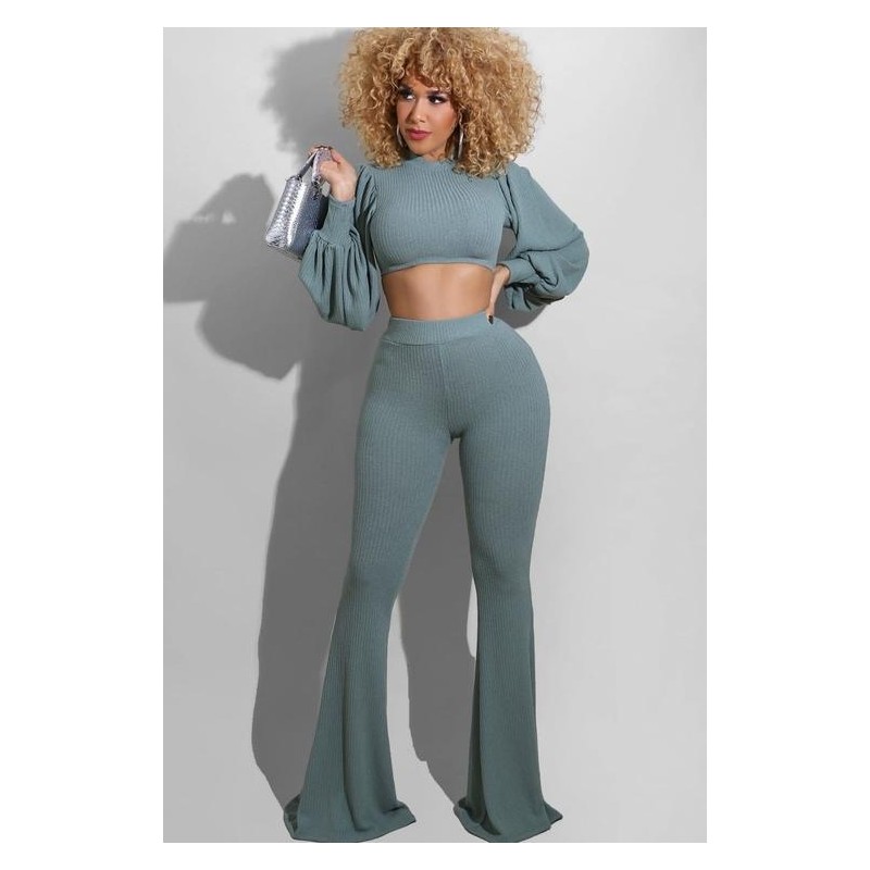 Set compuesto por top corto manga larga abultada ciello redondo y pantalon tipo palazzo acampanado, tela stretch tipo pants.