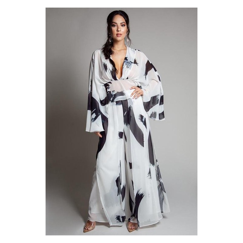 Set, conjunto compuesto por blusa manga campana escote tipo "V" de chiffon y palazzo plisado con forro, cierre y pretina.