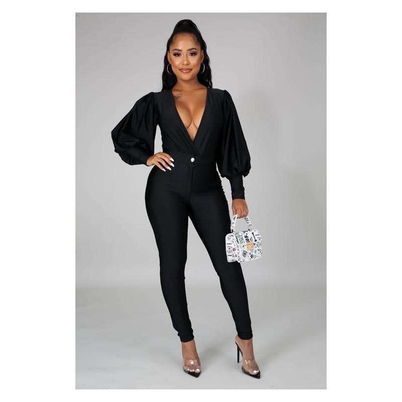 Set compuesto por pantiblusa manga 3/4 escote profundo cuello y abertura en mangas, y pantalon stretch corte alto con sierre y abotonadura al frente .
