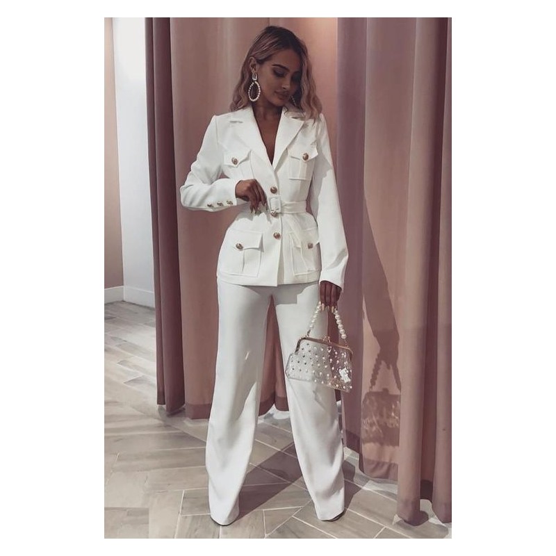 Traje compuesto por blazzer blanco recto botones dorados y pantalón corte alto con cierre. Cintilla en cintura.