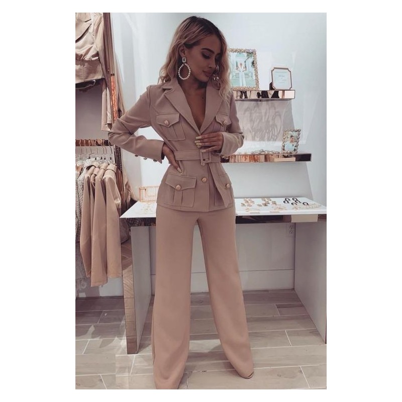 Traje compuesto por blazzer blanco recto botones dorados y pantalón corte alto con cierre. Cintilla en cintura.