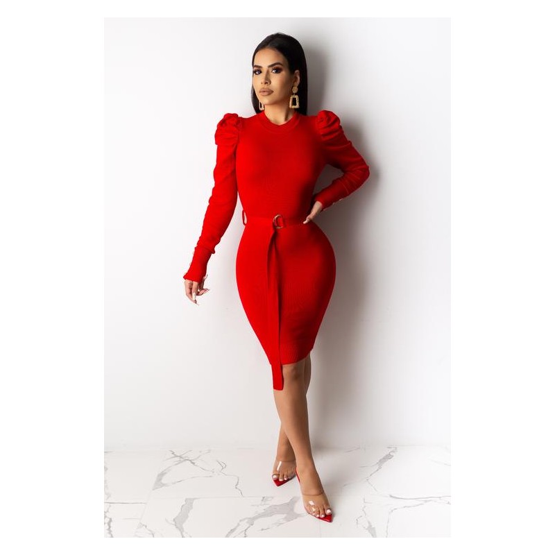 Vestido stretch cuello redondo manga larga abultada, cinturon tejido con hebilla tejido stretch.