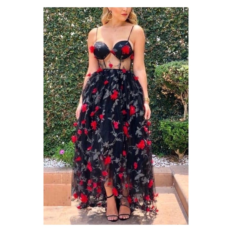 VESTIDO BLOSSOM NEGRO ROSAS BORDADO TULLE.