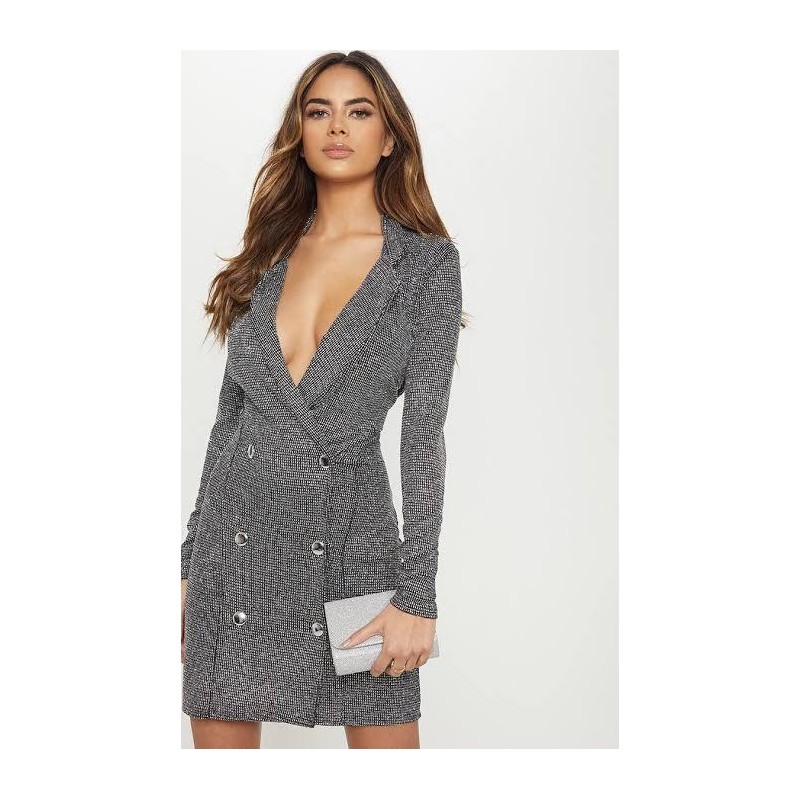 Vestido tipo blazzer (trench) abotonadura al frente manga larga y cuello estampado negro con plata. Forro