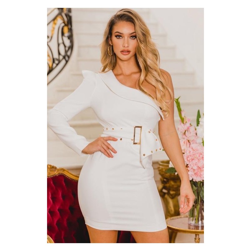 Vestido corto una manga  abultada en hombro entallado cinturon blanco con estoperoles dorados .