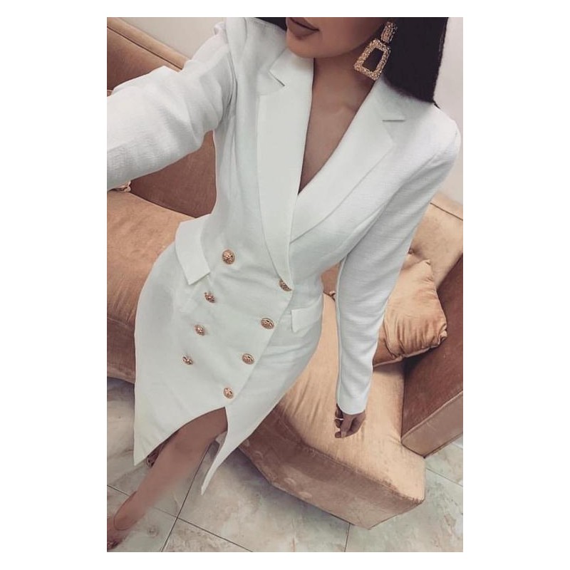 Vestido largo midi tipo blazzer cruzado con abotonadura al frente en dorada, cuello y manda larga con forro. Excelente calidad.