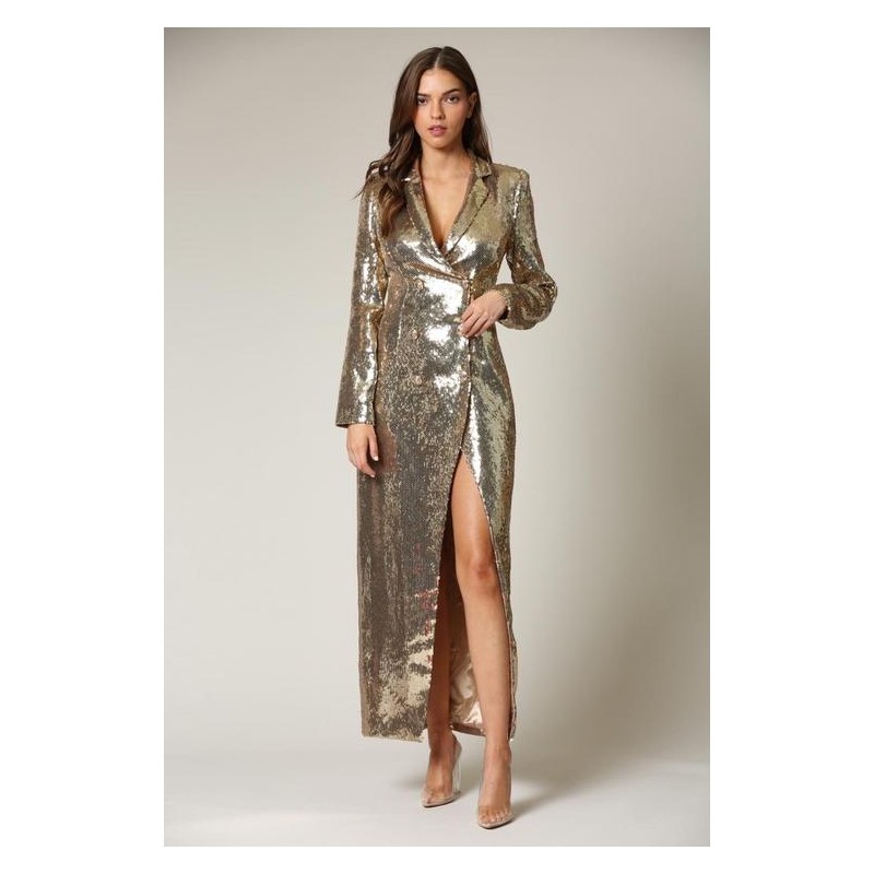 Vestido largo midi tipo blazzer cruzado con abotonadura al frente en dorada, cuello y manda larga con forro. Excelente calidad.
