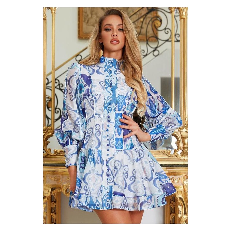Vestido manga larga abultada, cuello alto cierre en espalda, falda amplia multicapas corte "A".