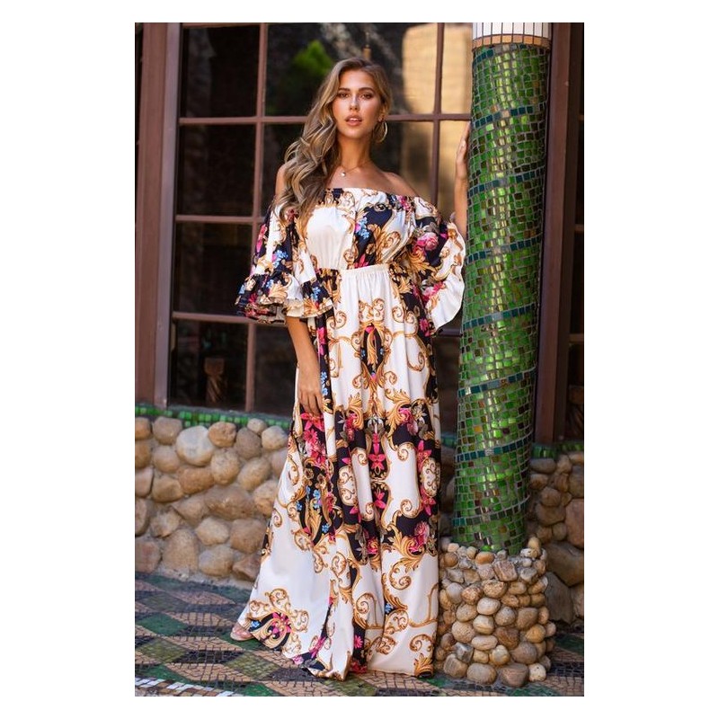 Maxi vestido semihombros resorte en hombros mangas 3/4 acampanadas resorte en cintura y maxi falda fluida ondulada. Tela