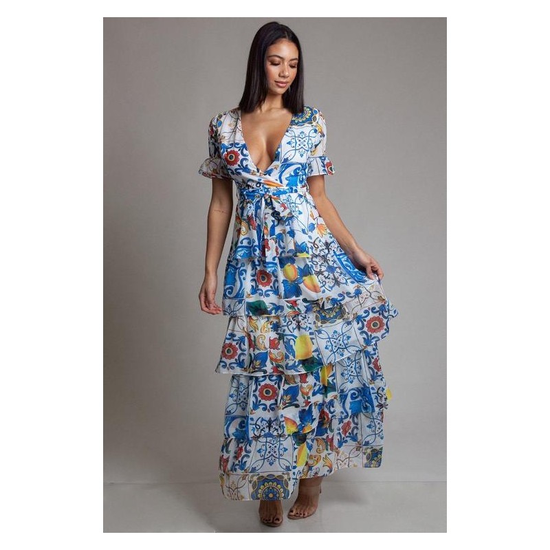 Maxi vestido manga corta abultada escote tipo "V" cruzado cintilla en cintura y  falda multicapas estampado tipo mosaico floral y frutal en tonos azules y blancos.Cinturón Incluido.