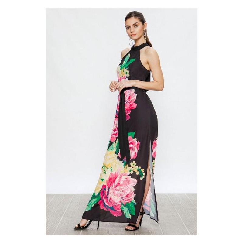 Vestido largo corte recto abertura en costados sin mangas cuello tipo halter de chiffon cinturon incluido . Estampado negro con flores multicolor en rosa.