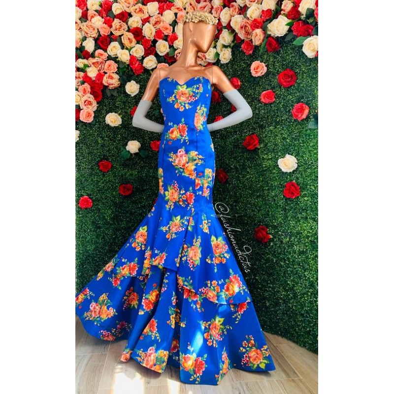 Maxi vestido tipo strapless corte sirena con falda en capas, estampado floral excelente calidad.