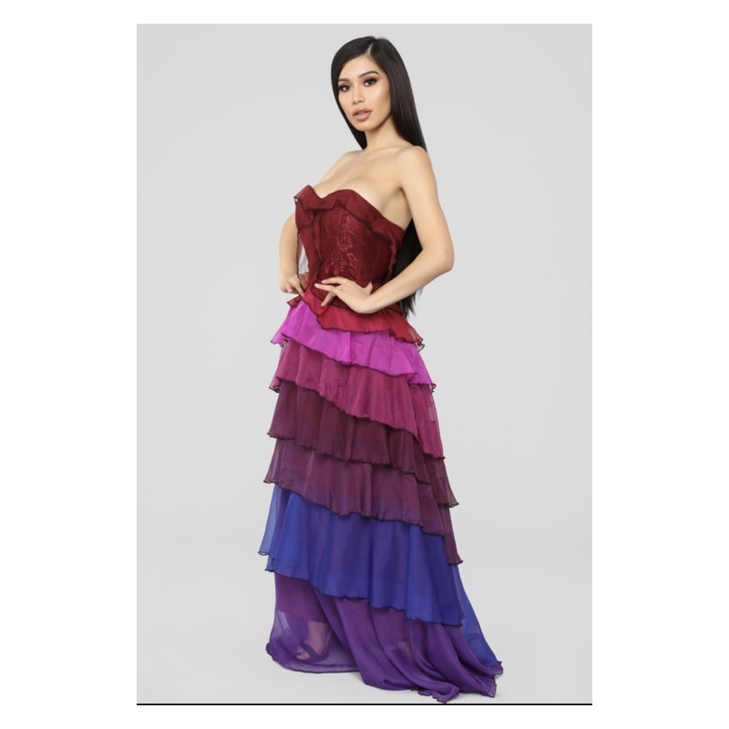 Maxi vestido degradado en multicapas tipo strapless violeta, cierre .