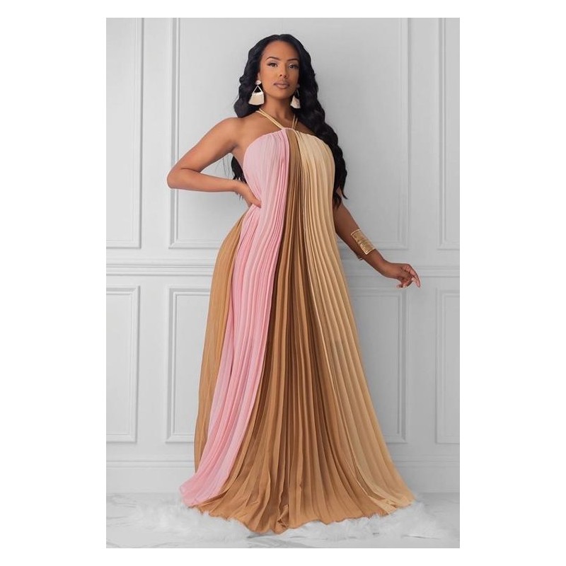 Maxi vestido tipo halter plisado amplio degradado en tonos pastel rosas y nude.