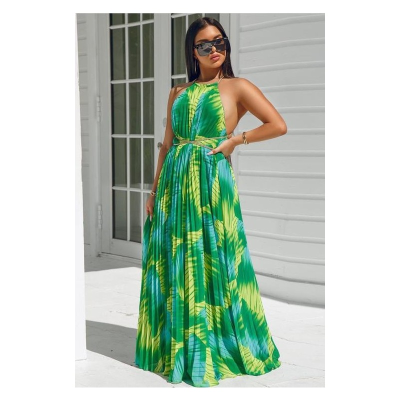 Maxi vestido tipo halter plisado amplio degradado y estampado tropical verde y amarillo.