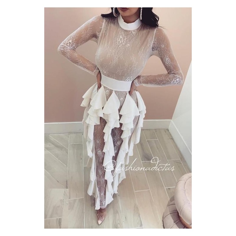 Maxi vestido atenea blanco manga larga fondo nude falda corta encaje blanco con aplicación rufle blanco. Cuello alto