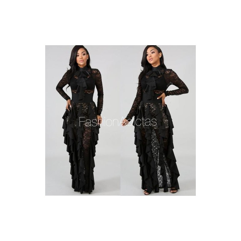 Maxi vestido atenea negro manga larga fondo nude falda corta encaje negro con aplicación rufle negro. Moño negro cuello alto.