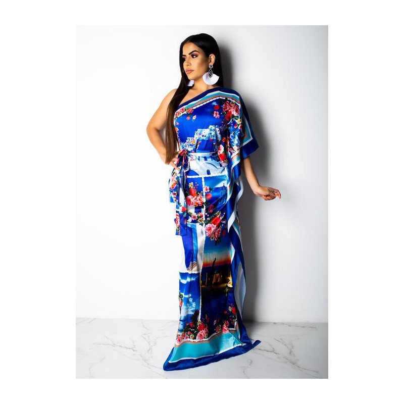 Maxi vestido recto satinado con estampado paisaje griego en tonos azules descubierto una manga , cintilla en cintura (cinturón incluido).