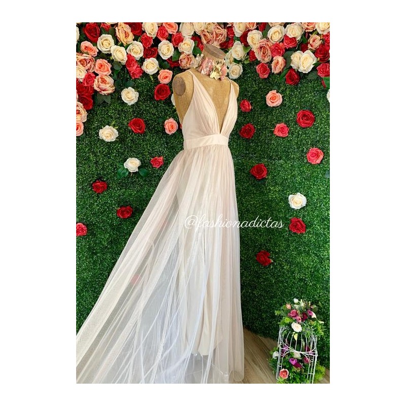 Hermoso vestido tirantes escotado y falda tipo tulle con forro abertura en piernas. Espalda tirante cruzado.