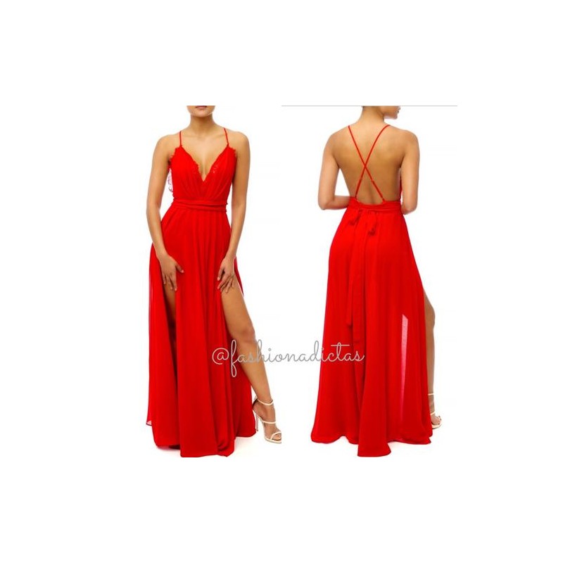 Maxi Vestido de tirantes, escote tipo "v" cruzado corte recto con abertura en ambas piernas, tirantes ajustables de chiffon. Excelente para una fiesta de jardín y de noche.