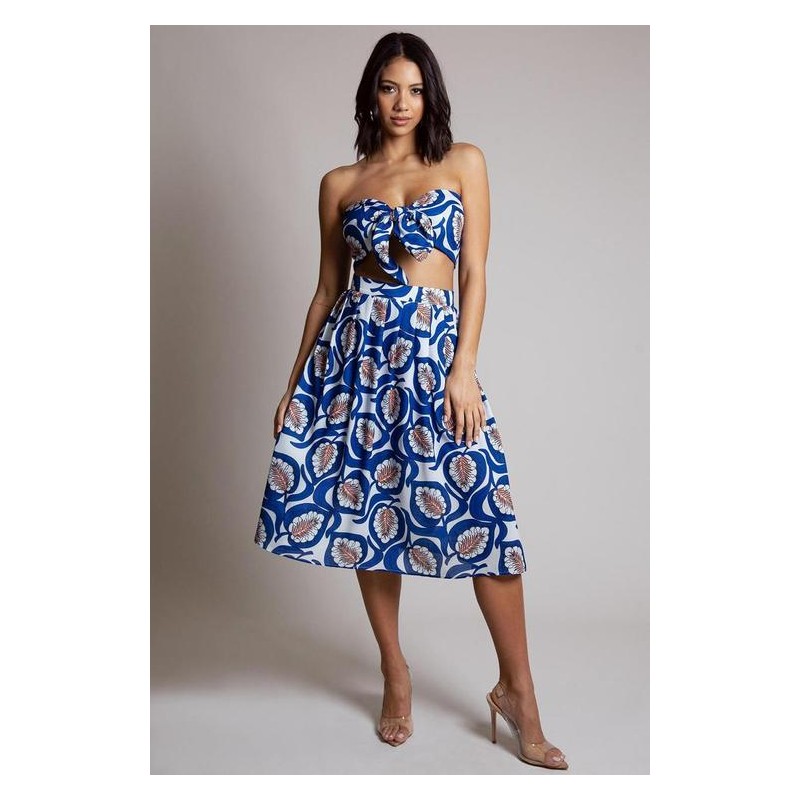 Set compuesto por top strapless en moño al frente cierre, y falda tipo midi pretina, estampado floral y hojas en tono azul y naranja.