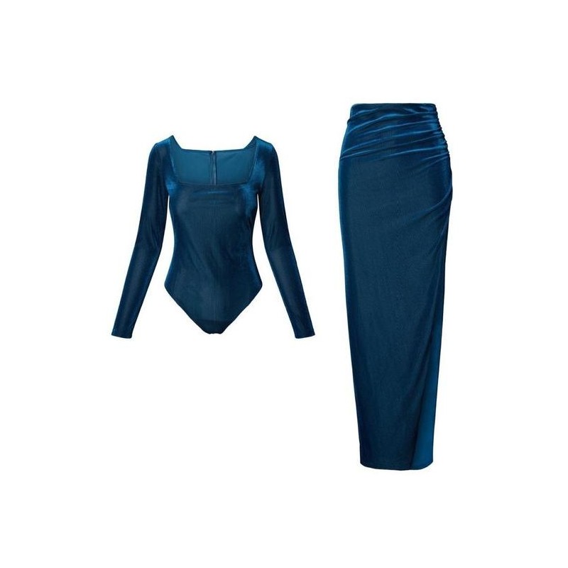 Set compuesto por pantiblusa manga larga cuello redondo y falda larga entallada abertura en pierna stretch .
