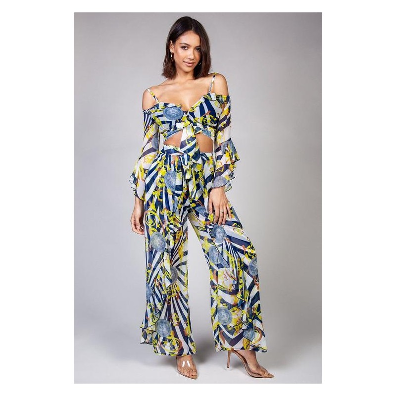 Set compuesto por top nudo al frente, tirantes ajustables, y palazzo abertura en pierna resorte en cintura. Estampado floral amarillo y azul.