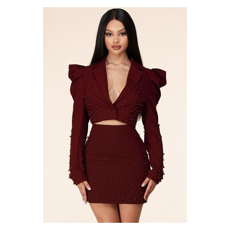 Set compuesto por blazzer corto manga abultada larga escote tipo "V" abotonadura al centro, falda corta aplicacion de perlas solor vino al frente en set.