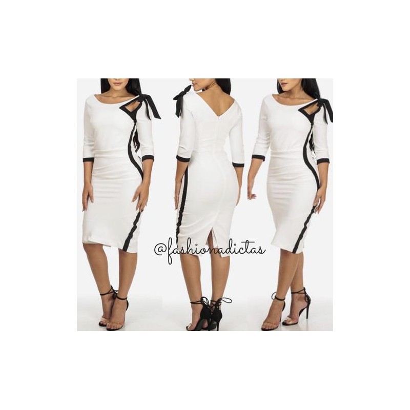 Vestido recto manga 3/4 entallado largo midi, costado en negro con moño en hombro, cierre en espalda.